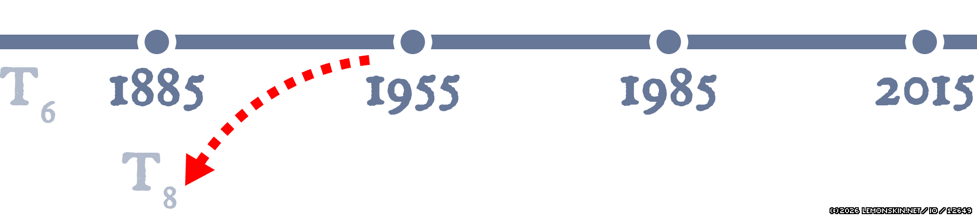 Qui accade una cosa curiosa: Doc, partendo dalla timeline T6, ha creato T7. Anche Marty, per salvarlo, sarebbe dovuto teoricamente partire dalla T6; ma, per trovare Doc nel 1895, prima di partire avrebbe dovuto attendere che l’onda degli eventi raggiungesse il 1955, altrimenti sarebbe arrivato in un passato senza il professore. Diamo dunque per scontato che, durante il tempo in cui va a cercare “l’altro” Doc del 1955, la realtà si sia aggiornata. Quando parte, arriva direttamente nella linea temporale T8, dove una nuova copia del Doc lo attende.