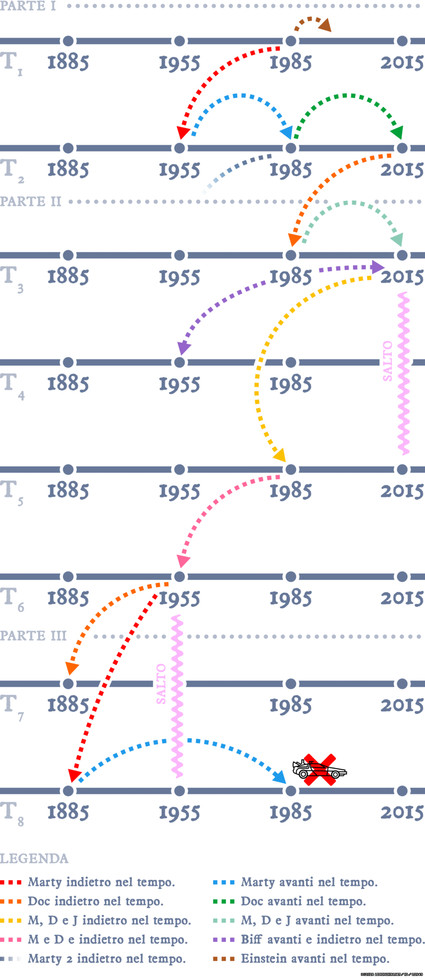 Esiste anche una timeline 9 con eventi che, rimbalzando avanti e indietro nel tempo, arrivano fino al 2070, e coinvolgono soltanto Doc. Ma, non essendo trattati nella trilogia cinematografica, non li ho inclusi in questo articolo.
