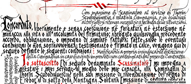 Il testo dei commenti alle clausole, che prima aveva dimensioni inconsistenti ed era spesso davvero troppo minuscolo da leggere agevolmente, è adesso più grande. Invece di un font già bello e pronto, ora le lettere sono state vergate a mano, lavoro che mi ha portato al limite della follia (immagina otto pagine in formato A4 da scrivere fitte fitte). Ho spudoratamente copiato lo stile del contratto originale inglese, che è meraviglioso. Ho poi aggiunto abbellimenti e piccoli virtuosismi grafici qui e là, per dare un po’ di dinamicità al tutto. Le scritte rosse ora non sono più rosse e basta: sono tracciate con pennino d’oca (o Aquila?) intinto in qualche sorta di inchiostro sicuramente composto col sangue di disgraziate creature non particolarmente care al Popolo Sotto le Montagne.