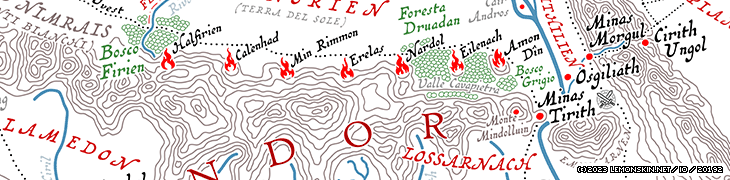 Al di là dell’italianizzazione di alcuni nomi (è curioso il fatto che in cinquant’anni a nessuno sia mai venuto in mente di tradurli) e di uno schema di colori votato a facilitare la lettura, ho preferito non apportare troppi cambiamenti. Ho leggermente ampliato la vista orizzontalmente, per conformare la mappa alle altre che ho realizzato (quella di Christopher è un pochino più quadrata) e ridisegnato i boschi con alberi più grandi e schematici, come avevo fatto con la Contea. Ho aggiunto anche delle iconiche nei punti in cui nel libro si sono svolte grandi battaglie (Minas Tirith, Morannon, Linhin, Pelargir).