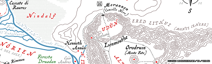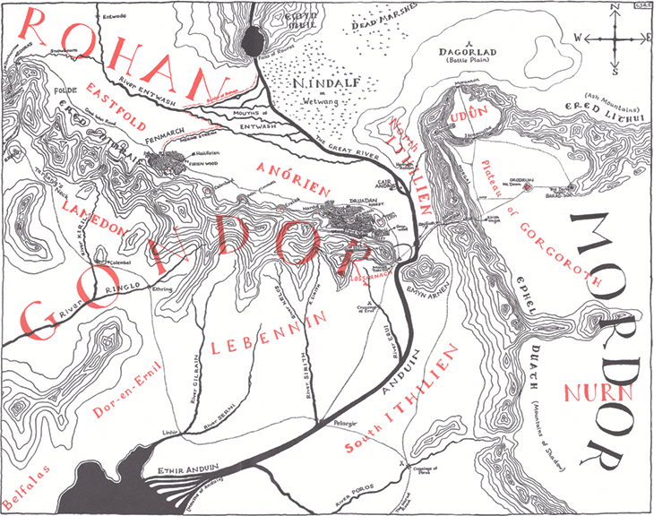 Anche in questo caso la mappa di partenza non è di Tolkien senior ma di suo figlio Christopher (non basterebbe un’intera vita per ringraziarlo per tutto ciò che ha fatto), e mostra una visione meno fantasy e più geologica dei territori:1Le bozze delle tre mappe dei libri erano naturalmente state disegnate da J.R.R., però il giovane rampollo aveva dimostrato grande talento nel disegno e spettò a lui l’onore di realizzare i disegni definitivi per la stampa.
