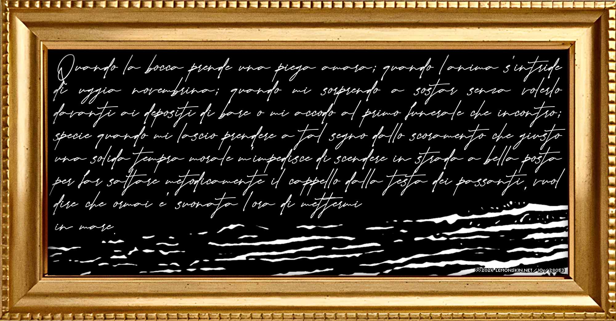 Quando la bocca prende una piega amara; quando l’anima s’intride di uggia novembrina; quando mi sorprendo a sostar senza volerlo davanti ai depositi di bare o mi accodo al primo funerale che incontro; specie quando mi lascio prendere a tal segno dallo scoramento che giusto una solida tempra morale m’impedisce di scendere in strada a bella posta per far saltare metodicamente il cappello dalla testa dei passanti, vuol dire che ormai è suonata l’ora di mettermi in mare.