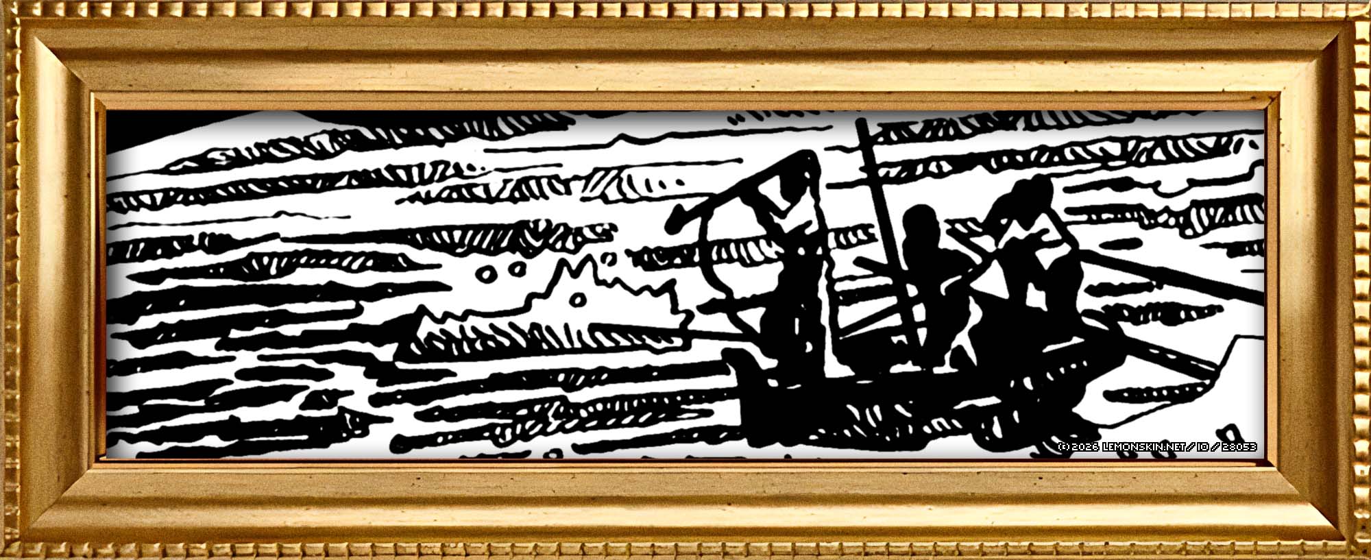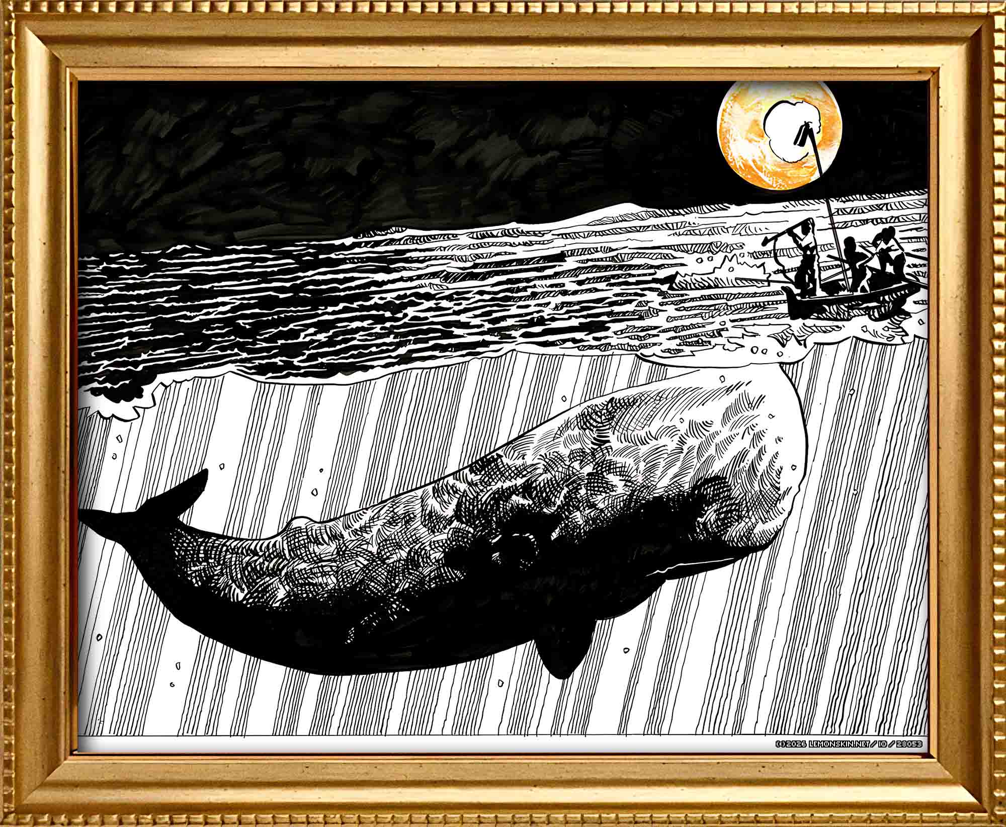 Esamina l’angosciante gracilità dell’instabile lancia, a stento trattenuta da esausti pagaiatori, nell’istante in cui l’ardimentoso ramponiere si erge solenne nell’atto di pungere la bestia — almeno nelle intenzioni.