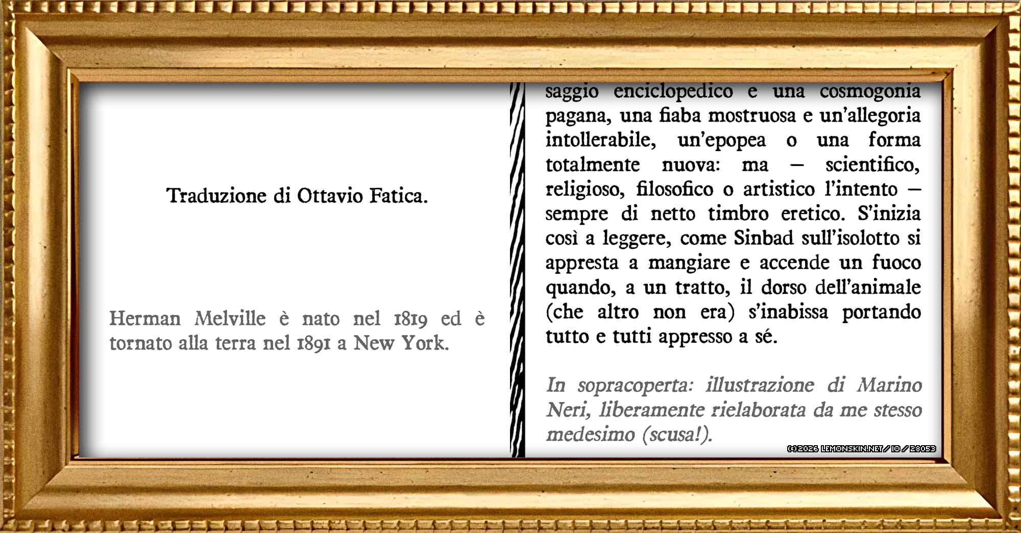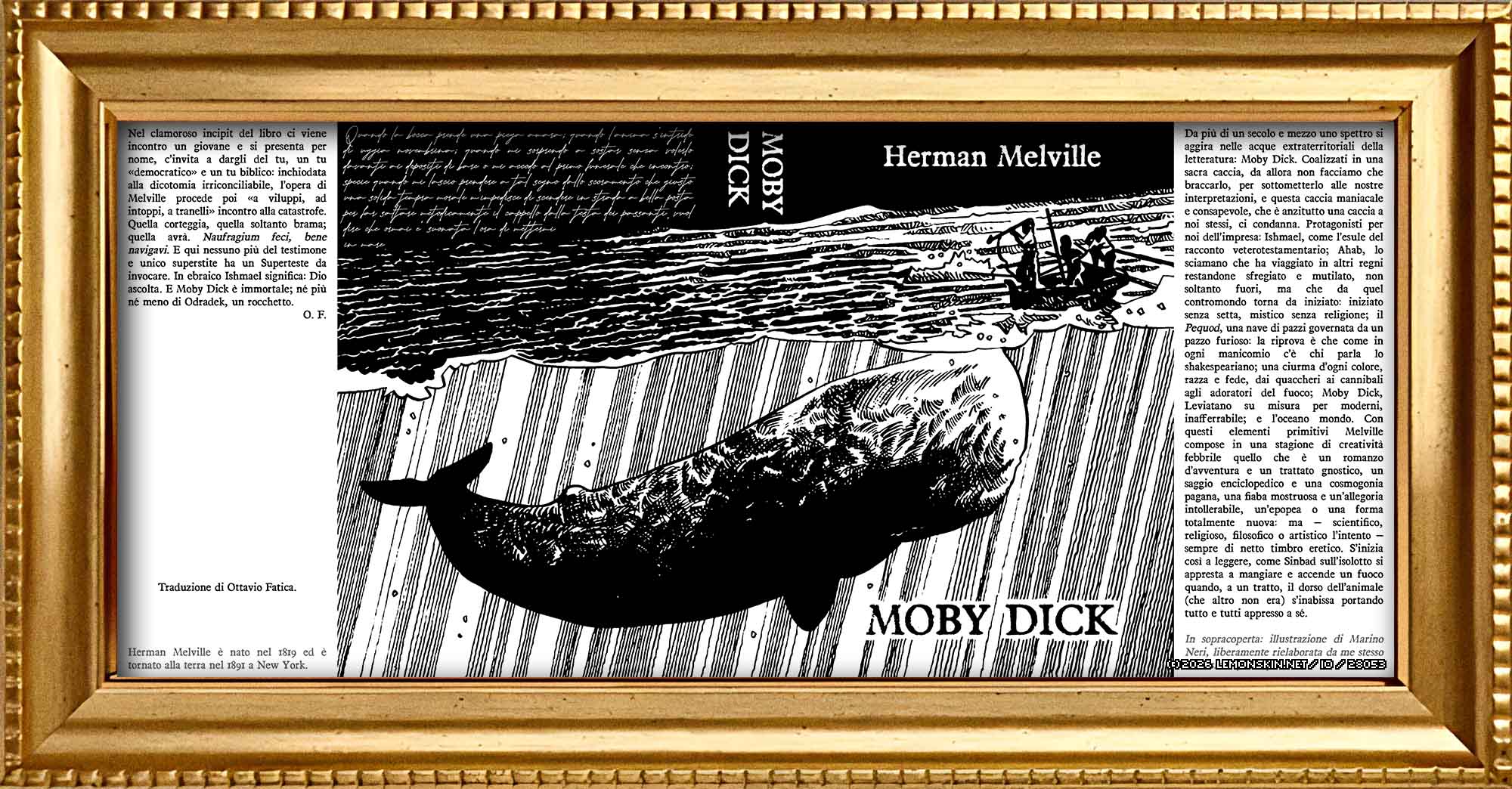 Risolsi alfine il rivendicar aggraziato calco del munifico tomo Moby Dick o il cetaceo, originato dall’ingegno fecondo di Melville H. e quivi trasposto nel di noi italico idioma dal dottissimo professor Fatica O.