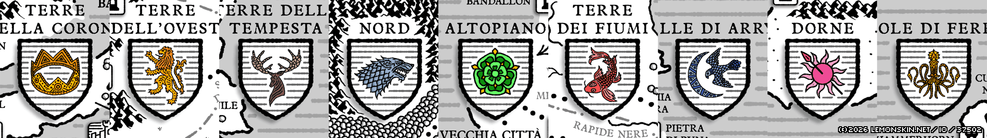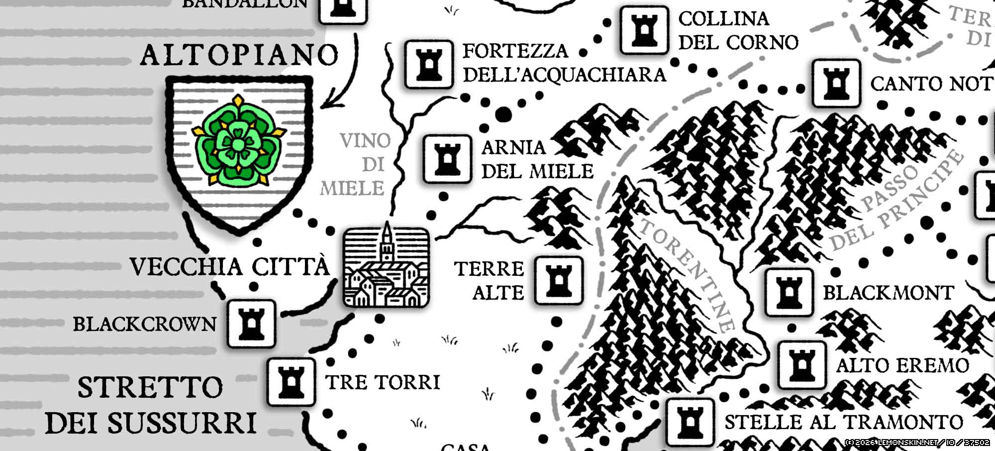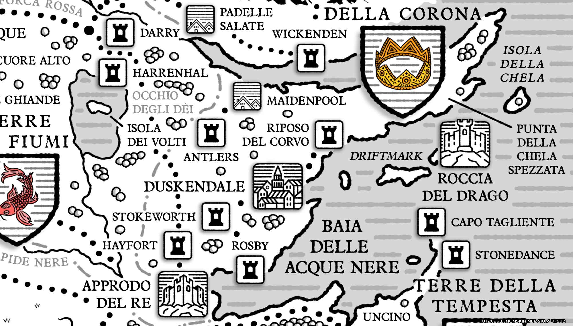 Ah, una piccola nota sugli stemmi dei casati: come ho già detto ho aggiunto una piccola nota di colore per evidenziarli, ma non ho seguito quelli canonici. Per capirci, lo stemma dei Tyrell di Alto giardino è una rosa dorata su sfondo verde. Purtroppo questo sistema non funzionava, perché colorare lo sfondo avrebbe distratto troppo l’occhio dalla mappa. Sono quindi andato di fantasia, avvalendomi di schemi cromatici differenti per non ricadere sempre negli stessi (il blu, il rosso e l’oro erano inflazionatissimi).