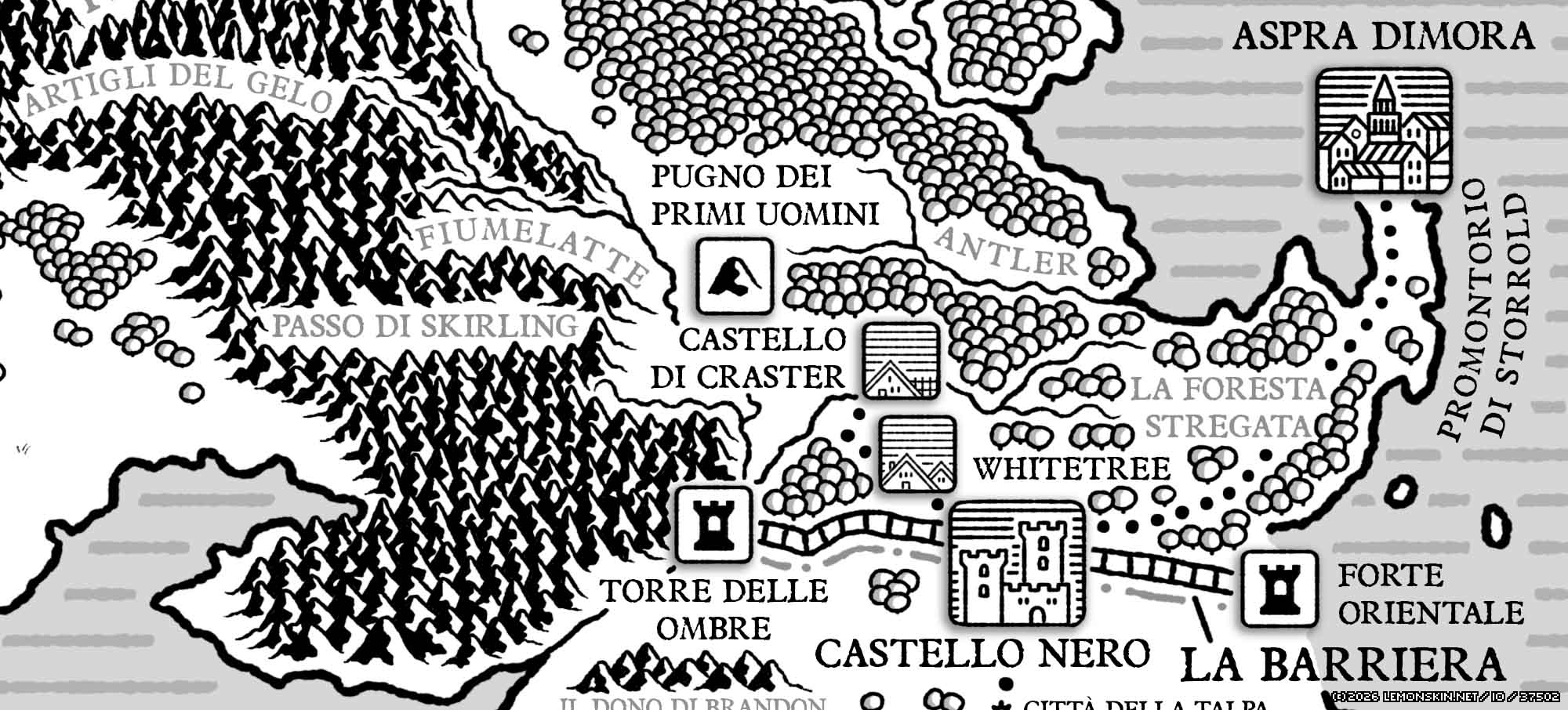 Approfitto di questa immagine per farti notare il castello di Craster. Nonostante il nome, non si tratta un castello ma della comune dimora di uno scontroso membro del Popolo Libero. L’icona mostra quindi una casetta con un recinto.