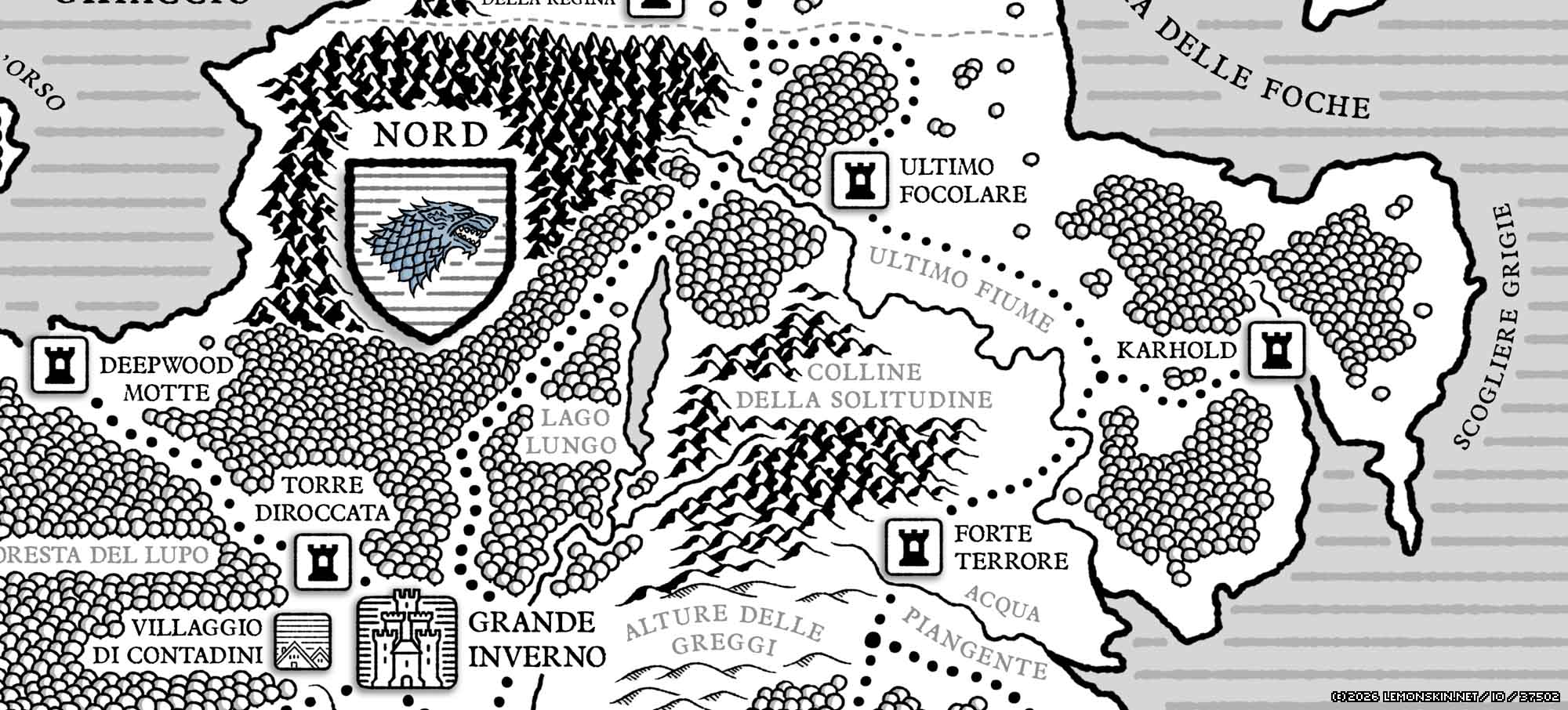 Ho aggiunto il nome del regno e il logo della famiglia che domina il rispettivo territorio (ho indicato anche i confini), ed è l’unico particolare a colori dell’intera mappa, perché non volevo distogliere l’attenzione dalle informazioni. Le innumerevoli torrette sparse un po’ ovunque, più piccole rispetto ai castelli e ai centri abitati principali, indicano solitamente edifici fortificati di entità minore: il maniero di una grande famiglia, oppure un fortilizio, o una rovina. I villaggi sono anch’essi indicati con un’iconcina minore, puoi vederne uno alla sinistra di Grande Inverno.