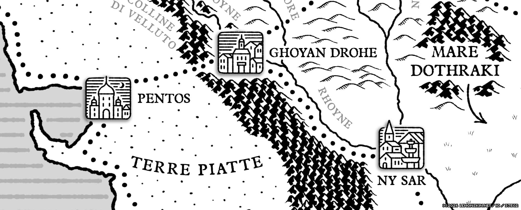 Sì, certo. Ecco la mappa del libro:1Lo so, fa schifo… ma non sono riuscito a trovarla a una risoluzione decente per cui l’ho ingrandita avvalendomi dell’Intelligenza Artificiale. Se non altro i nomi si riescono a leggere.