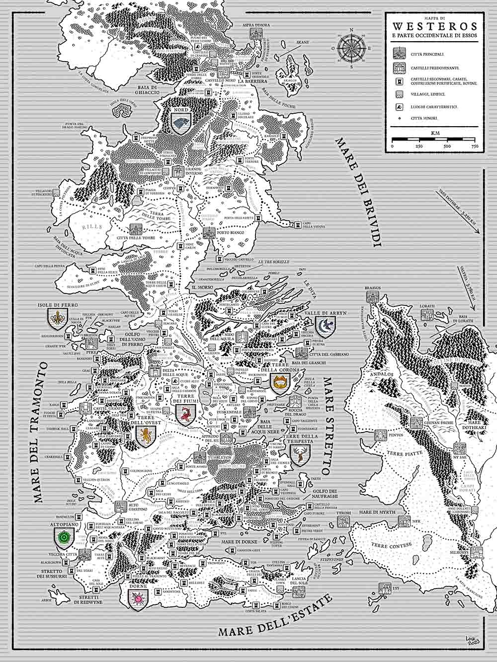 Il mondo creato da Martin è decisamente complesso. Parliamo di almeno nove territori principali piuttosto estesi. Se prendessimo a paragone la classica mappa della Terra di Mezzo di Tolkien, ci starebbe dentro circa quattro volte. Ogni singolo centimetro quadrato è densamente popolato da città, fortezze, castelli, rovine e ci saranno come minimo un centinaio di casate, ognuna con il proprio signorotto locale e il proprio seguito. Casate che vengono spesso nominate all’interno dei libri e che, in precedenza, non avevo la più pallida idea di dove si trovassero.