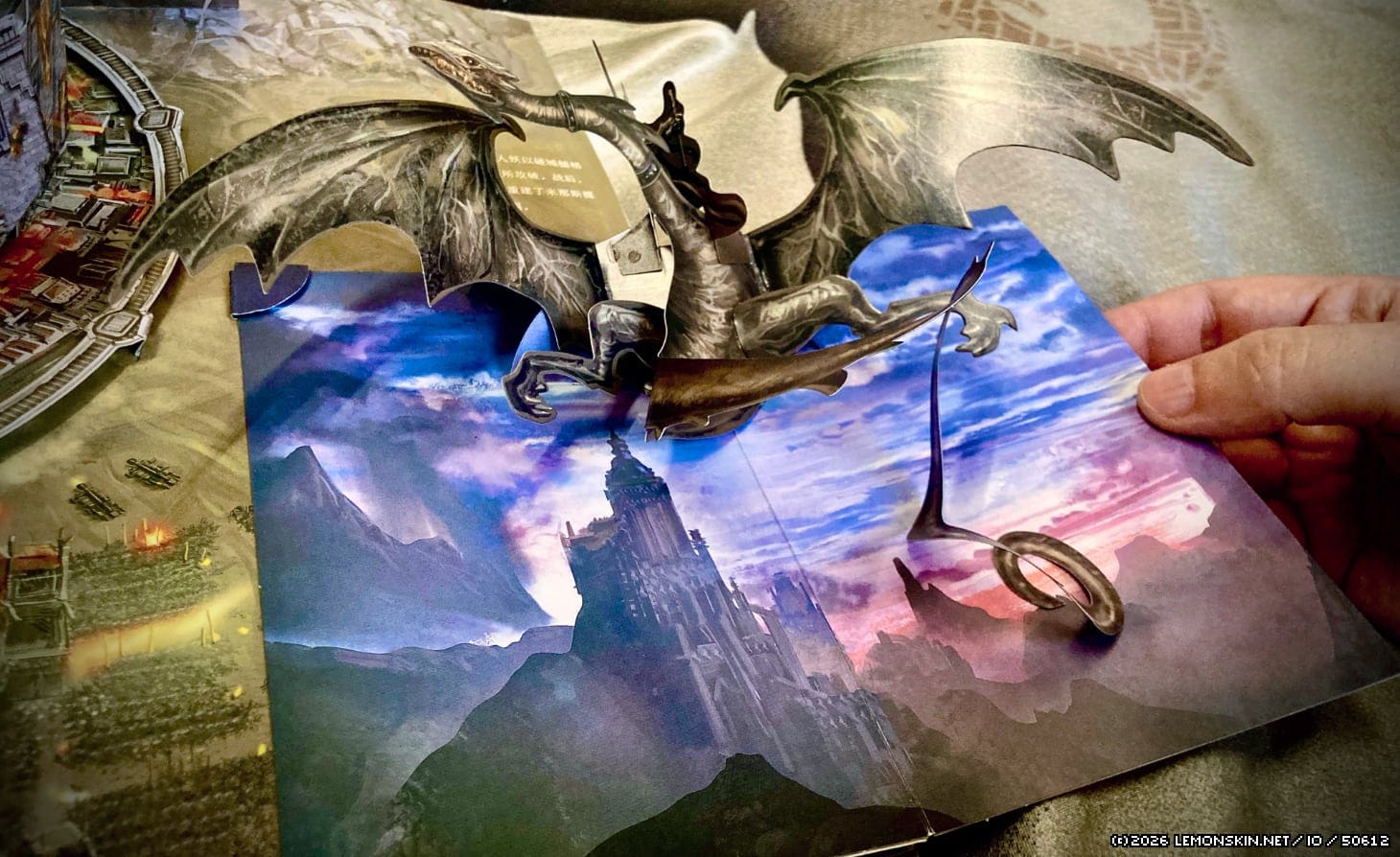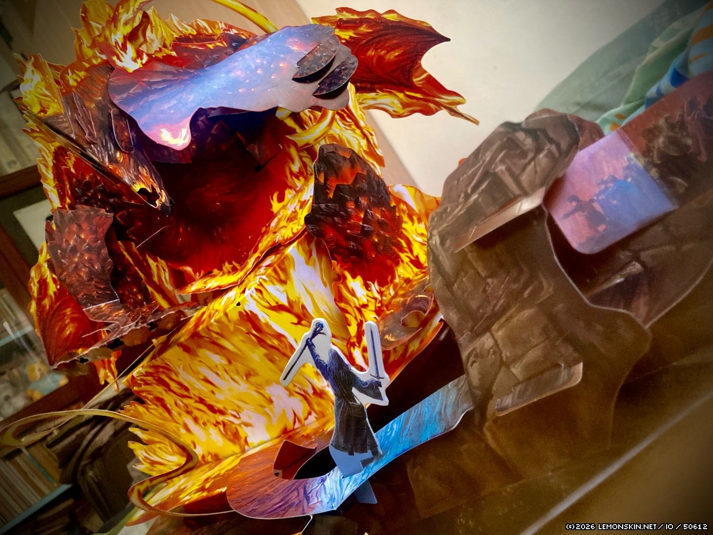 All’interno degli spaziosi corridoi di Khazam-dûm, un Balrog torreggia minaccioso su Gandalf e su tutti noi. Si tratta di un elemento imponente, inaspettato, spaventoso, che sorge dalle fiamme e invade la stanza. Il genio di Yan Tian (谈天) – responsabile della struttura popup – è disarmante: come riesca a comprimere oggetti tanto grandi all’interno della pagina (più avanti troveremo esempi ancora più sorprendenti) è quasi inspiegabile.