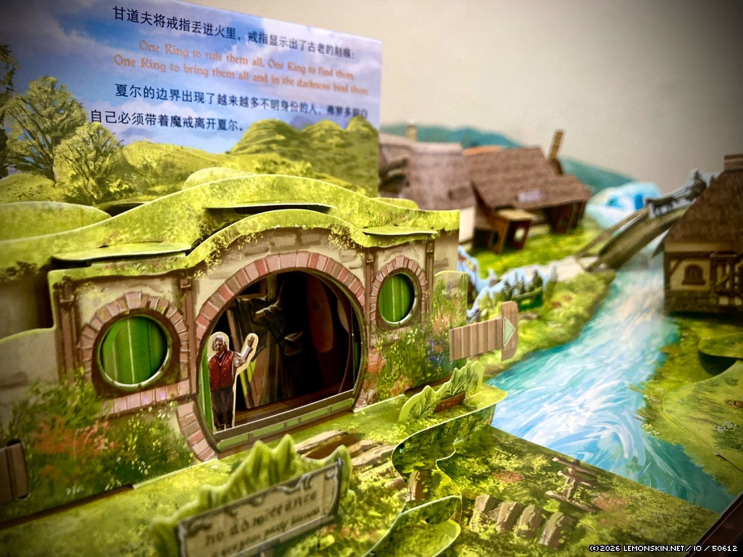 Una differente inquadratura dello stesso scenario. Aprendo la pagina tutto si anima e prende vita. Il ponte si inarca per davvero sopra il fiume e intorno all’area della Festa per il compleanno di Bilbo, si possono apprezzare tutti i negozi e le locande di Hobbiton (o Hobbiville, se preferisci).