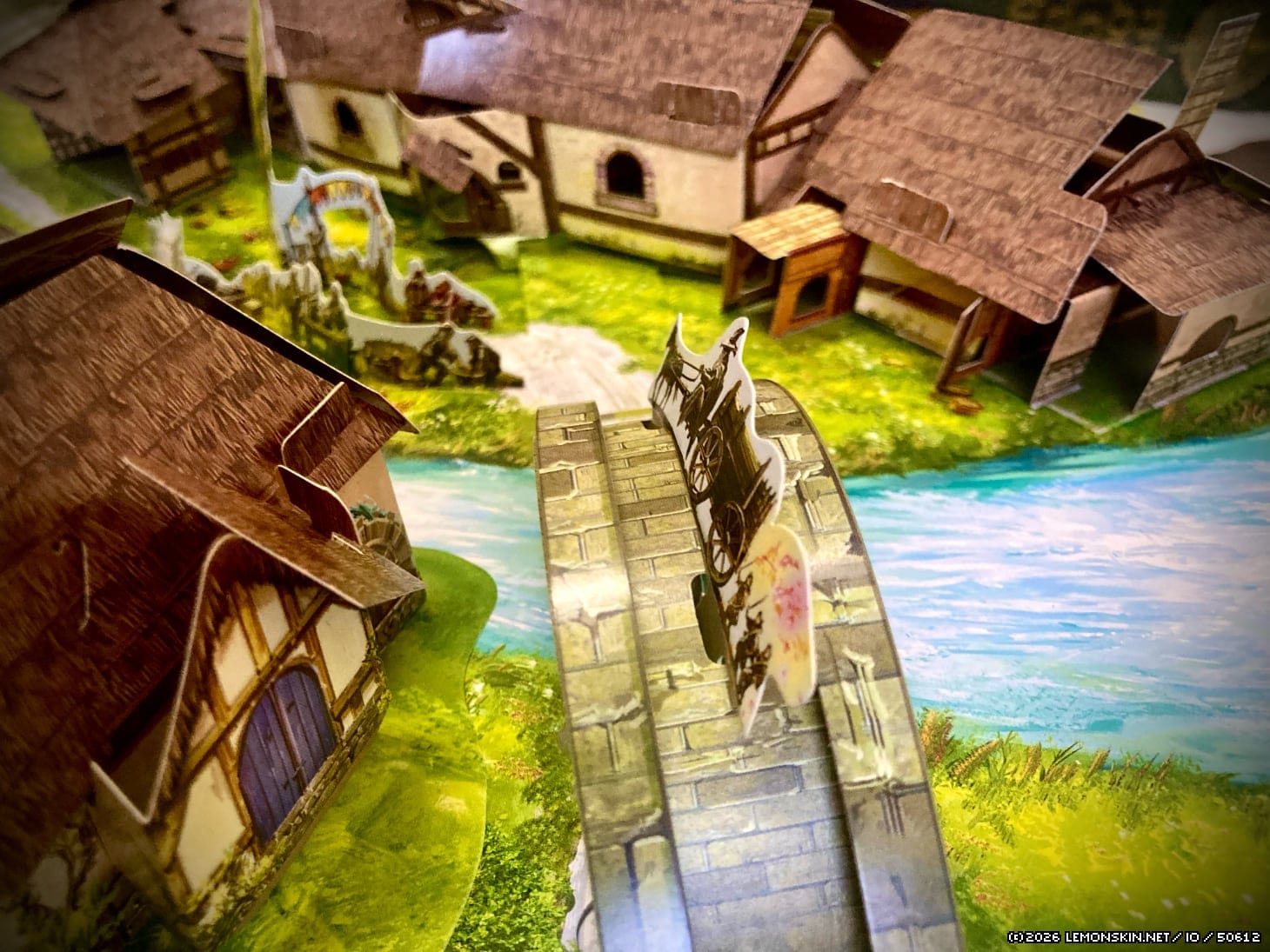 Sullo sfondo case e fattorie e, ancora più in là, nuovamente lo stregone (evidentemente dotato del dono dell’ubiquità) che col proprio carretto attraversa il ponte sul fiume.