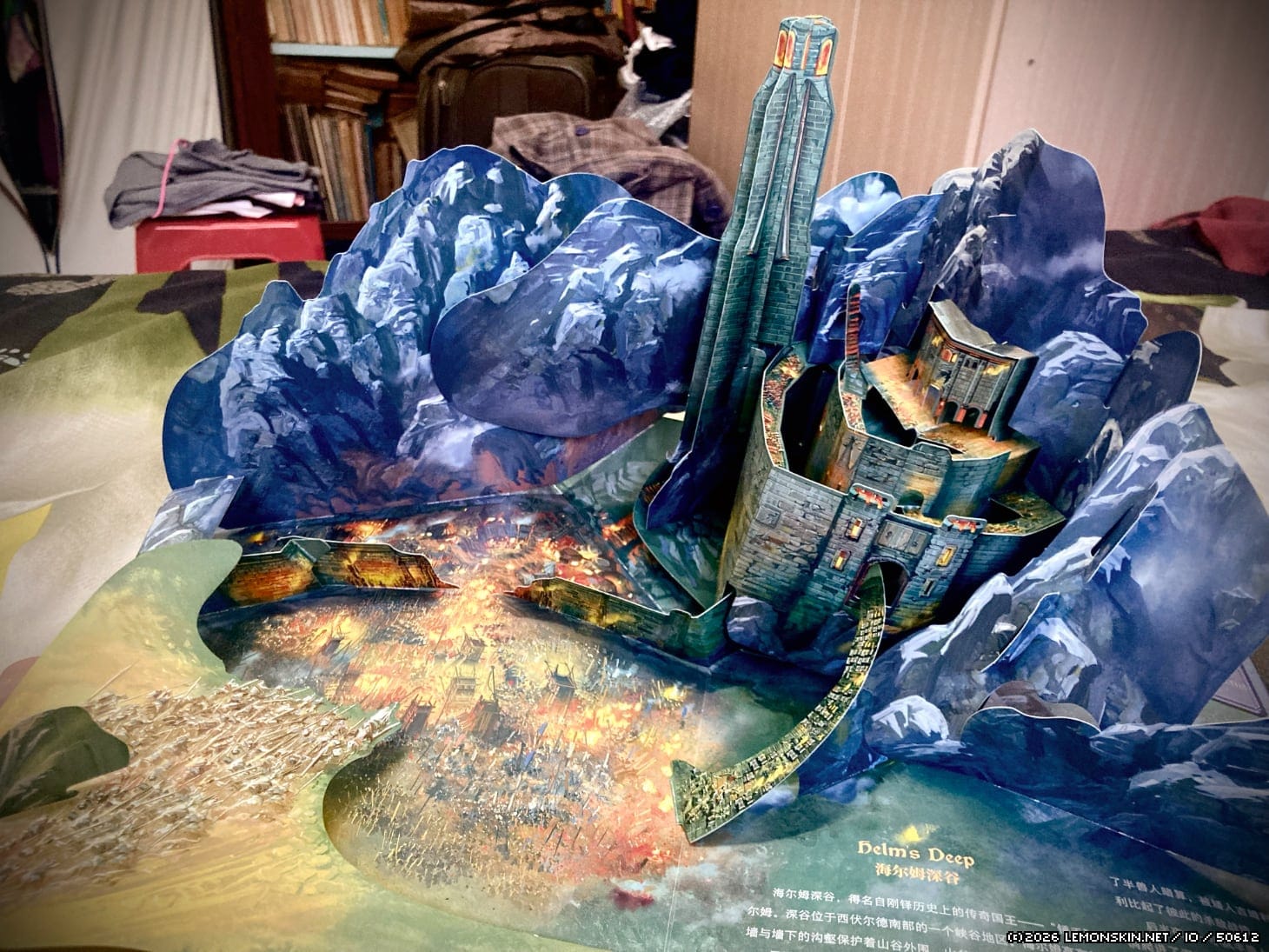 Ammirate, gente, la sontuosità del Fosso di Helm, con le sue difese esterne (violate dall’esplosivo di Saruman), con l’alzata laterale, le erte mura interne e il torreggiante Trombatorrione! Con le montagne a proteggere il retro della fortezza e, dietro le montagne, i miei vestiti gettati alla rinfusa nella stanza.