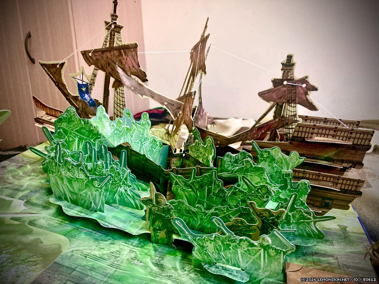 A Pelargir Aragorn e la Grigia Compagnia, dopo aver ottenuto la collaborazione dell’esercito dei Morti, conquistano la flotta dei Corsari di Umbar. Notare la bellezza del contrasto tra i colori freddi degli Spettri (i morti) e quelli caldi del galeone sul fondale (i vivi). È presente anche lo stendardo donato da Arwin ad Aragorn, che sarà in seguito dispiegato al suo arrivo a Minas Tirith: un vessillo dalla natura trivalente, capace di rincuorare gli alleati, incutere timore nei nemici e suggellare simbolicamente l’agognato ritorno del Re.