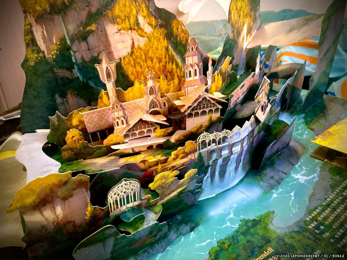 Girando pagina ci ritroviamo davanti la grande bellezza dell’arte elica: la città di Rivendell (o Gran Burrone, o Imladris). Sfortunatamente l’effetto della profondità si appiattisce nelle foto, ma dal vivo tutto ha una propria collocazione spazia e una propria dimensione.